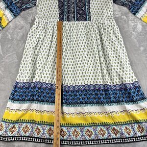 ~ So much fun details in this colorful dress! White with splashes of blue, yellow, and fuchsia. Buttons and loops down the front, 3/4 bells sleeve, lined skirt. Elastic at waist.