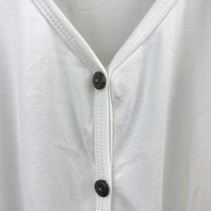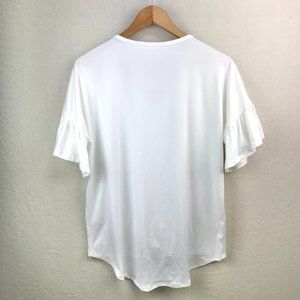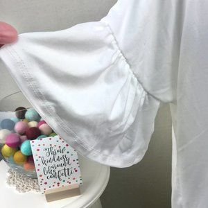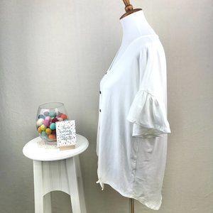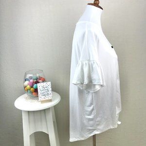 Cute, lightweight, and very soft neutral white top. Versatile and would go great with leggings, jeans, or a skirt. V-neck and low/high cut front to back. Features ruffled elbow length sleeves and a tie front. Never worn. New without tags.