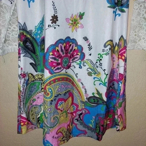 Lace on sleeves, front pocket and on neck and shoulder. 96% Rayon 4% Spandex
