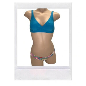 Floral bikini bottom with thick stretchy band on waist and tealnhalter bikini top.