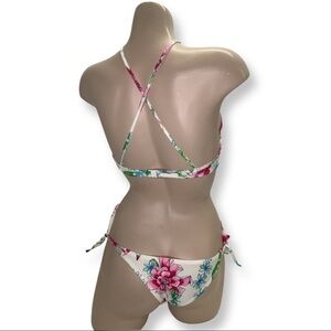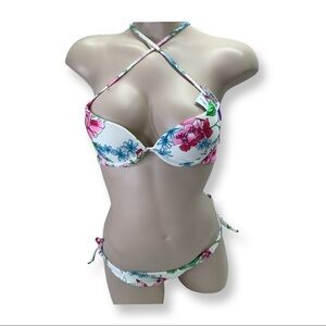 Brazilian Tropical Print Bikini Set. Colorful Floral Print Bikini Top. The print is bedazzled with multi stones and comes underwire and clasp closure and matching floral bikini bottom with Side Ties. So sweet and Sexy Tropical Bikini Set. Made in Brazil. Pattern placement differs on each set.