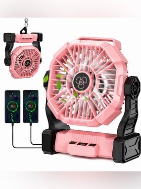 Compact rechargeable desk fan in pink. Adjustable angle and sturdy base. USB powered for on-the-go cooling. Quiet airflow and portable handle for easy carrying.