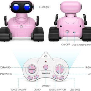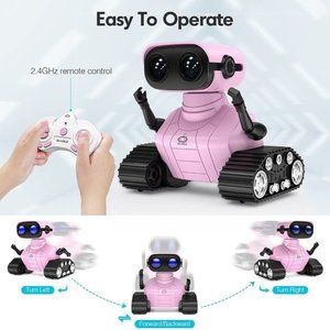 🤖Multifunctional Robot: LED eyes will light up once you turn on the robot, you can also closed it or let it blink by remote; voice function - turn on the robot it will start talk with you in his own language, he can also sing 3 songs which can swich by remote; the tank tracks - let the robot move forward backward left and right,when it switch to demo mode it will begin dancing.