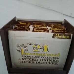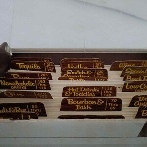 A Catalog of 333 "Recipe Cards for Mixed Drinks and Horsd'oeuvres" in color. The case is cracked but cards are in excellent condition. Also includes a 237 page "Bartender's Black Book" of drink recipes. (White-out was used on bartender's book to erase a phone number that was written on page 1.) (See last picture.)