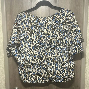 Reckless Hearts blue, orange and black print top. Short sleeved boxy fit. Size Med.