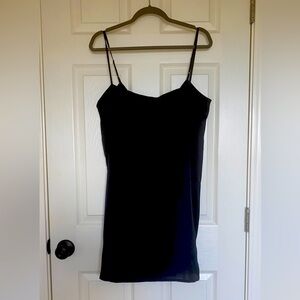 Satin cami dress with embroidery detail. Delicate cross cross straps at back. Adjustable straps.