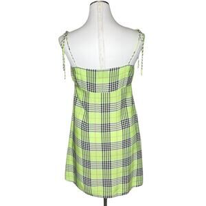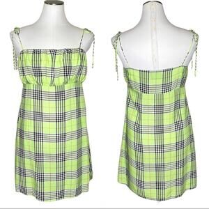 Reclaimed Vintage inspired check print cami mini dress in neon green size 10. Has square neckline, self tie shoulder straps, side zip closure and the bust area is lined. No flaws, it’s in excellent condition.