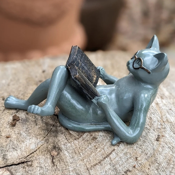 Check out my unique & authentic garden collectible cat figurine featuring a reclined cat wearing glasses, in a stylish gray color, engrossed in a book. Perfect for cat lovers and bookworms alike. This dude has read several books in a garden, so he may have a mark or two here or there etc.