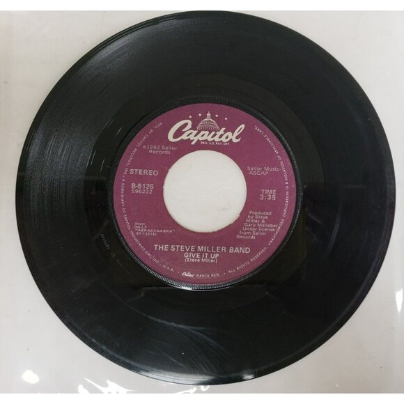 This 45 RPM 7" vinyl record features The Steve Miller Band performing "Abracadabra" and "Give It Up". B-5126S98230A. Sailor Music- ASCAP. Produced by Steve Miller & Gary Mallaber Under license from Sailor Records. MFD. by Captiol Records, Inc., A Subsidiary of Capitol Industries- EMI, INC., U.S.A.