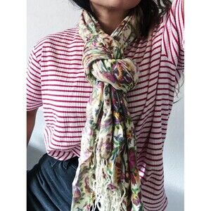 Rectangular floral paisley scarf Fringe at either end Cream base with pink, green and other colors Very bright and cheery Some runs throughout scarf Width 28 Length 70 not including fringe Fringe 3.25