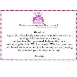 Please note: Beauty for Ashes Boutique® and Beauty for Ashes® carries t-shirts, worship flags, clothing, jewelry and accessories; many with our trademark brand name 'Beauty for Ashes' - which means God will restore Beauty in place of life's ashes - Isaiah 61:3. None of our items carry literal ashes. Instead, our items carry the blessings of God representing restoration and divine destiny for each individual.