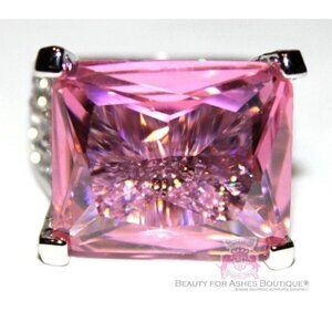 Beauty for Ashes Boutique Jewelry presents this is a SPECTACULAR PINK ICE CZ Ring! Super Sparkly and such remarkable quality. The main stone size is 1/2" x 3/4", and has an emerald-cut pink CZ. The band is packed full of pave cz's in clear in the front, which are noticeable when looking through the pink cz! Extra Thick 5 mil. White Gold Rhodium Plating! Make an excellent gift, great for all occasions!