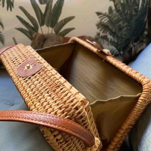 This hollow rectangle straw bag is a show stopping piece that matches with everything. It has an attached brown strap that measures 46 inches from one side to the other. The strap does not adjust. Exterior is made of a straw material and interior is lined with a green cotton/polyester lining.