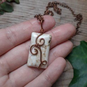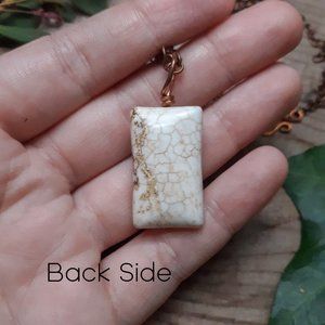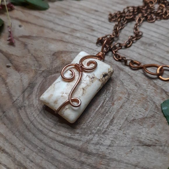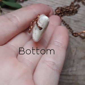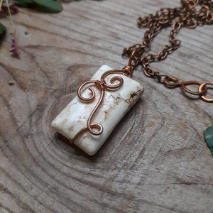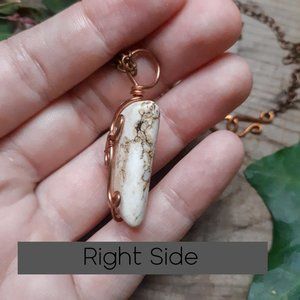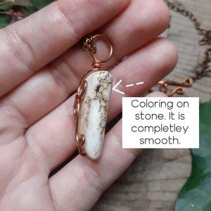 I think this is magnesite. Hand wrapped in copper wire. This stone has a cool coloring on the right side, it is completely smooth and not a crack.