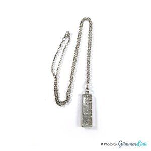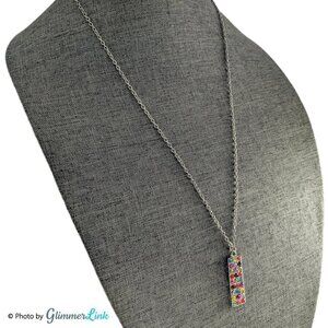 Rectangular silver tone pendant necklace accented with multicolor rhinestone crystals.