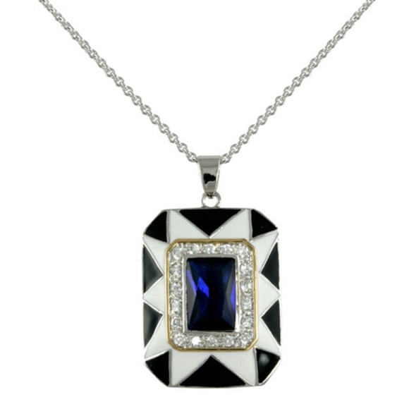 Rhodium 2 tone necklace with black and white enamel, 1.8 x12mm rectangular sapphire glass and (18) 2mm round white CZs on a 16 inch 245 tiffany chain.