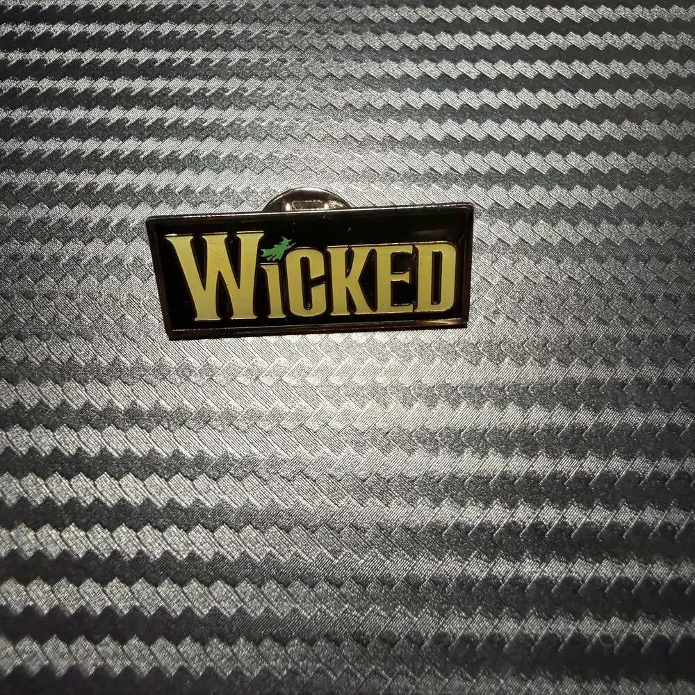 Wicked the Musical Rectangular Logo Lapel Pin, Black and Gold Enamel. This Broadway collectible features the iconic Wicked font with the green witch silhouette. Perfect for collectors and theater fans alike. High-quality metal construction with a secure pin back. Excellent pre-owned condition with no noticeable scratches or tarnishing. Great for jackets, hats, or lanyards.