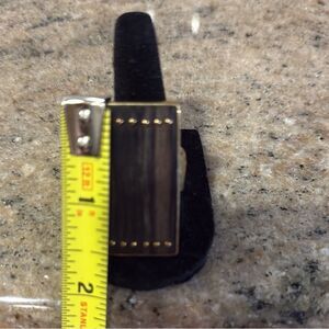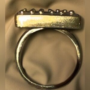 Stylish rectangular ring with wood inlay and gold accents. Unique design with stud details.