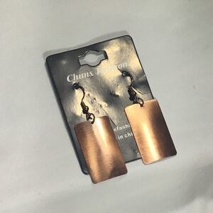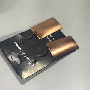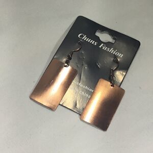 Simple, yet elegant. Thin metal in a rectangular cut and a copper tone dangle from fish hook backs