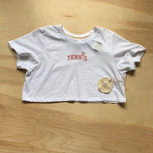 Adorable crop top has the word “Tennis” on the front in soft pink writing. Off-white color. Cuffed sleeves. Round neck. Made from plastic bottles and scraps of fabric. Based on this there are minor natural streaks in back of shirt. No price tags. Underarm flat across is 20”. Shirt length is 14”.