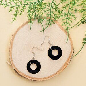 A pure black from antique black depression glass dishware! The broken dishes have been taken from the old glass dumps, ground and fired into beautiful glass hoops that measure approx. 3/4" across (just a tiny bit smaller than a quarter) and hang from sterling rings and surgical steel french hook ear wires. Lightweight and comfortable, weighing 0.1 ounces (the same weight as a dime).