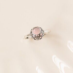 Adorable addition to our Vintage Lace collection! The beautiful vintage lace design reminiscent of antique lace pieces, hold the glowing glass gem handmade from the broken reclaimed vintage bottles and dishware. The gem inside is 7mm, the total width at the widest point of the lace design is 3/8" (just under 1/2"). Fully adjustable band to fit any finger! Beautiful glowing pale pastel pink glass from broken antique pink depression glass dishware.
