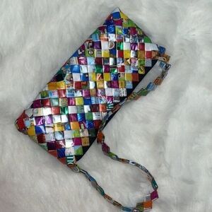 Eco-friendly purse is woven from recycled candy and cookie wrappers