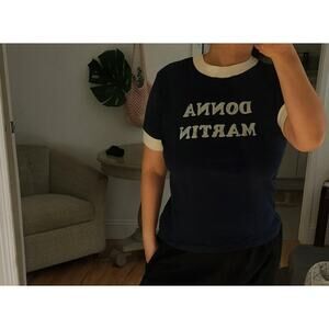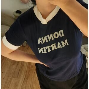 This Recycled Karma ringer T-shirt features a bold "Donna Martin" graphic on a navy blue base with cream contrast trim. Crafted from 100% cotton and made in the USA, it offers a soft, comfortable fit with vintage-inspired flair. Sized as Medium (M/M), this retro tee is perfect for casual wear or as a standout statement piece for fans of nostalgic style. Let me know if you have any questions or need additional details!
