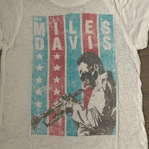 Pay some respect to Miles Davis with our super soft fitted tee. Graphic features the legendary musician Miles Davis, playing his iconic trumpet on a backsplash of red and blue stripes. Made out of super soft vintage washed fabric with a fitted silhouette, sewn rolled up short sleeves, and distressed detailing on the hems.