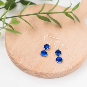 What could be better than one piece of our glowing antique glass? TWO! Our Double Take line features two beautiful gems handmade from these broken reclaimed antiques, where they are ground and fired, then set into the beautiful sterling silver beaded settings. Prong set to be secure. Extra long sterling silver ear wires come with rubber stoppers to keep them safely in place. Features the beautiful glowing cobalt glass from vintage 1960's skin cream jars. Each piece includes "The Story of the Glass" detailing the history and age of the glass used. Top gem measures 7mm, bottom gem measures 8mm, and the total hang length of the earrings is approx. 3/4".