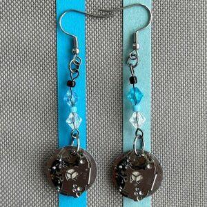 These Handmade Earrings are made from recycled watch faces, a mixture of plastic beads and seed beads. Since the watch faces are recycled, keep in mind that they are not new, therefore, you'll find small scratches, as well as, wear and tear. The mechanism of the watch face is also intact on the back of the earring.