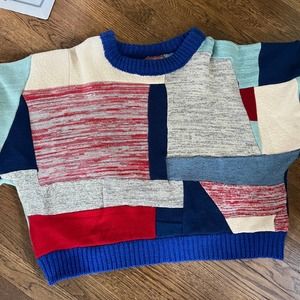 This gorgeous sweater has amazing color (mostly reds, blues, ivory, and greay) pattern and texture from recycled woolend patchworked to this beautiful oversized piece. Ridiculously soft, etra roomy and very thick and warm.