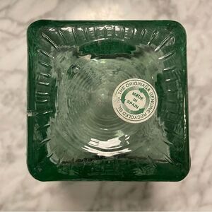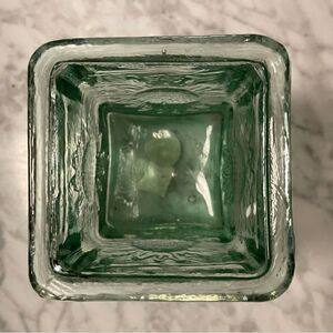 This cute glass candle holder is in excellent pre-owned condition. There are no chips or cracks. The green glass is recycled so it has a more rustic look. Each side has an embossed sunflower pressed into the glass. It is approximately 3 1/2" square.