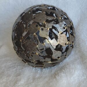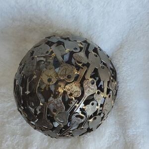 This is a spectacular decor and conversation piece. This metal key sphere measures about 6" in diameter. Made from a variety of old metal keys.