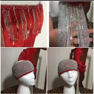 The base is a red metallic stretchy fabric with layers of red fringe over.