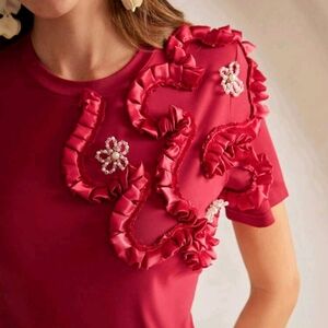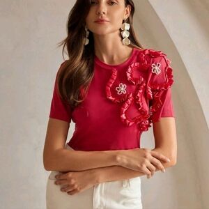 Red 3D Floral Elastic Crew Neck Short Sleeve T-Shirt For Women