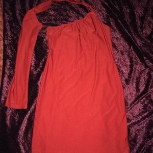 Worn once!! This is the little red dress that completes Valentine's Day!! Red Mini halter dress with half left sleeve!! Great with pumps and a clutch!!