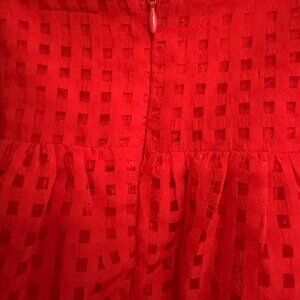 Bright red sleeveless babydoll top featuring adjustable tie straps, a flattering square neckline, and a flowy, relaxed fit. Made from a lightweight textured woven fabric with subtle check detailing that adds dimension and interest. Finished with a softly gathered waist and easy, breezy silhouette.