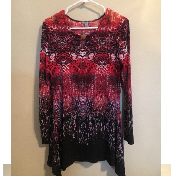 Red asymmetrical tunic dress. Fabric is nice and stretch so it fits well at the top then flows to the asymmetrical hemline towards the bottom. Fabric doesn’t wrinkle which is another plus.