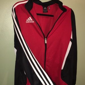 Red adidas soccer jacket. In perfect condition and never been worn. Tag says XL but model is M.