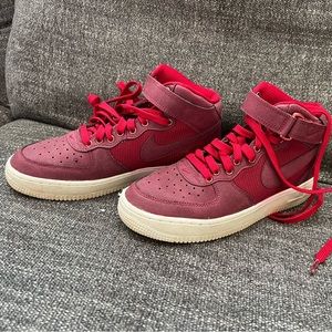 Gently used red forces. They’re a youth size 6.5, but fit women’s 8.5. Some discoloration on the rubber towards the bottoms, but other than that shoes are in good condition.