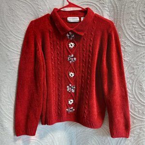Red Alfred Dunner Cable Knit Chenille Sweater With Floral Embroidery.