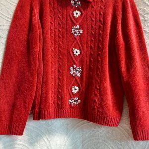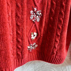 Red Alfred Dunner Cable Knit Chenille Sweater With Floral Embroidery Size PXL