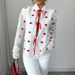Red And White Casual Women's Contrast Heart Cut-Out Tie Up Blouse