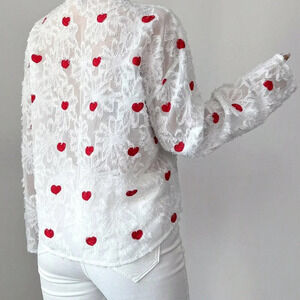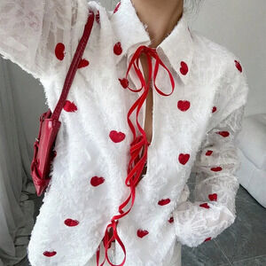 Red And White Casual Women's Contrast Heart Cut-Out Tie Up Blouse