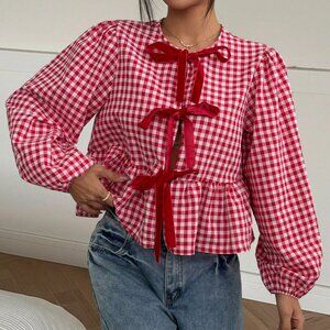 Add a splash of retro charm with this red and white gingham and colorblock peplum top. A round neck and long sleeves frame a loose, regular‑length silhouette, while the playful plaid accents bring a cute cowgirl‑hippie vibe. Ideal for layering over denim or pairing with skirts, this piece blends casual comfort with eye‑catching pattern detail.
