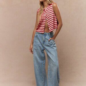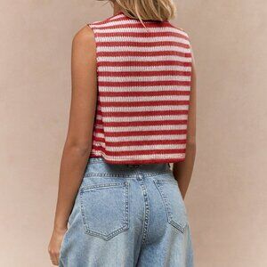 Red And White Casual Women's Style Button Front Knit Crop Vest Sleeveless Top