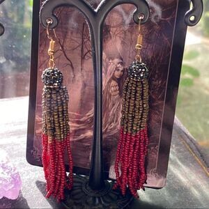 Red And Green Seed Bead Tassel Pave Crystal Earrings