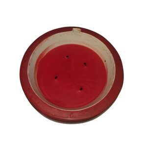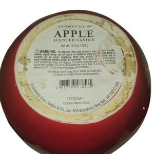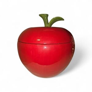 Charming red apple-shaped ceramic container with 1/2 used candle. Features a green stem handle. Still smells amazing!