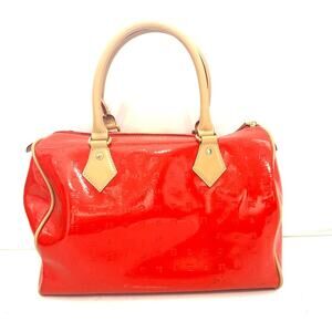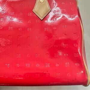 Good used condition! Bright red embossed patent leather Arcadia bag. Custom pop art on front with black yellow and blue with picture of woman on telephone. Tan trim and gold hardware. White interior with one zippered pocket. Interior has minor spots as well as back exterior all shown in photos.